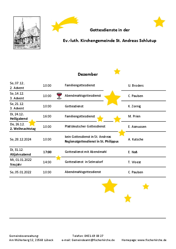 Wir feiern jeden Sonntag um 10 Uhr Gottesdienst in der Fischerkirche St. Andreas, um gemeinsam zu beten, zu singen, Gottes Wort zu hören und Kraft zu schöpfen für den Alltag.