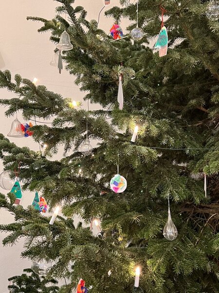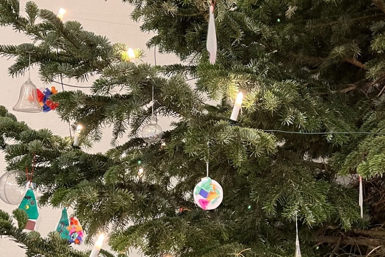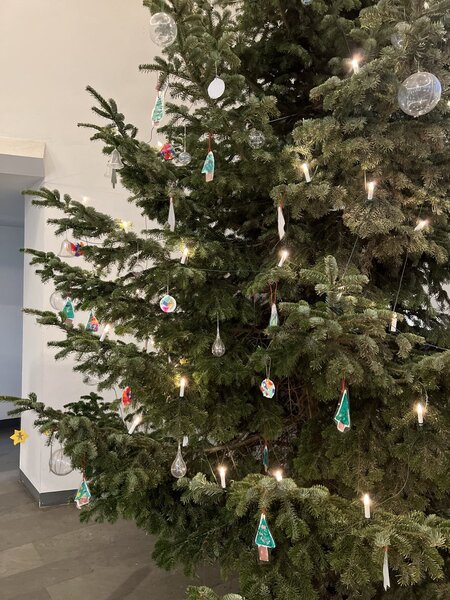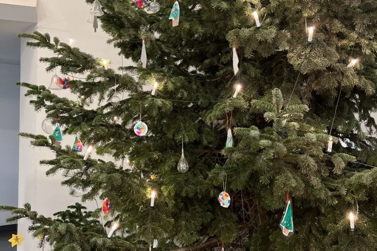 - Die Kinder unseres Evangelischen Kindergartens haben etwas gebastelt und ihre weihnachtlichen Kunstwerke dann in den Baum gehängt. Eine richtig schöne Idee unserer neuen Leitung und des gesamten Teams.