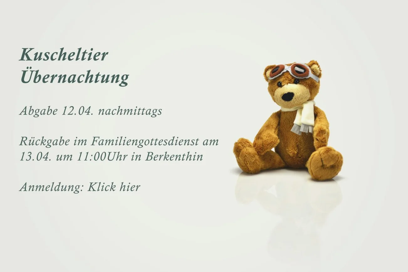 Im April ist es soweit! Dann kann Dein Kuscheltier ein neues Abenteuer erleben und ein neues Fotoalbum bekommen, nämlich aus der Kirche in Berkenthin! Am Samstag, den 12. April kannst Du Dein Kuscheltier zwischen 14 und 16 Uhr in die Kirche in Berkenthin bringen. Dort wird es wieder viele tolle Dinge erleben! Beim Familiengottesdienst am Sonntag, den 13. April kannst Du Dein Kuscheltier wieder in den Arm nehmen.