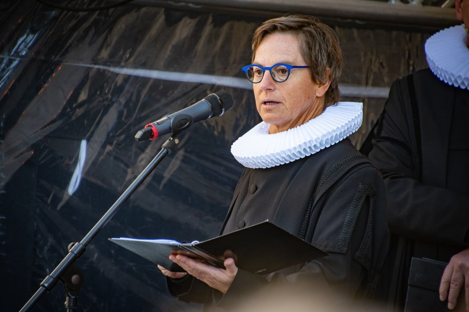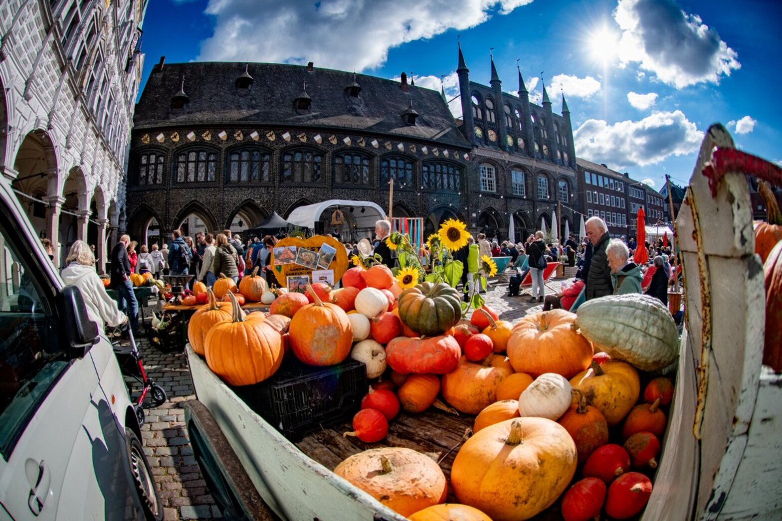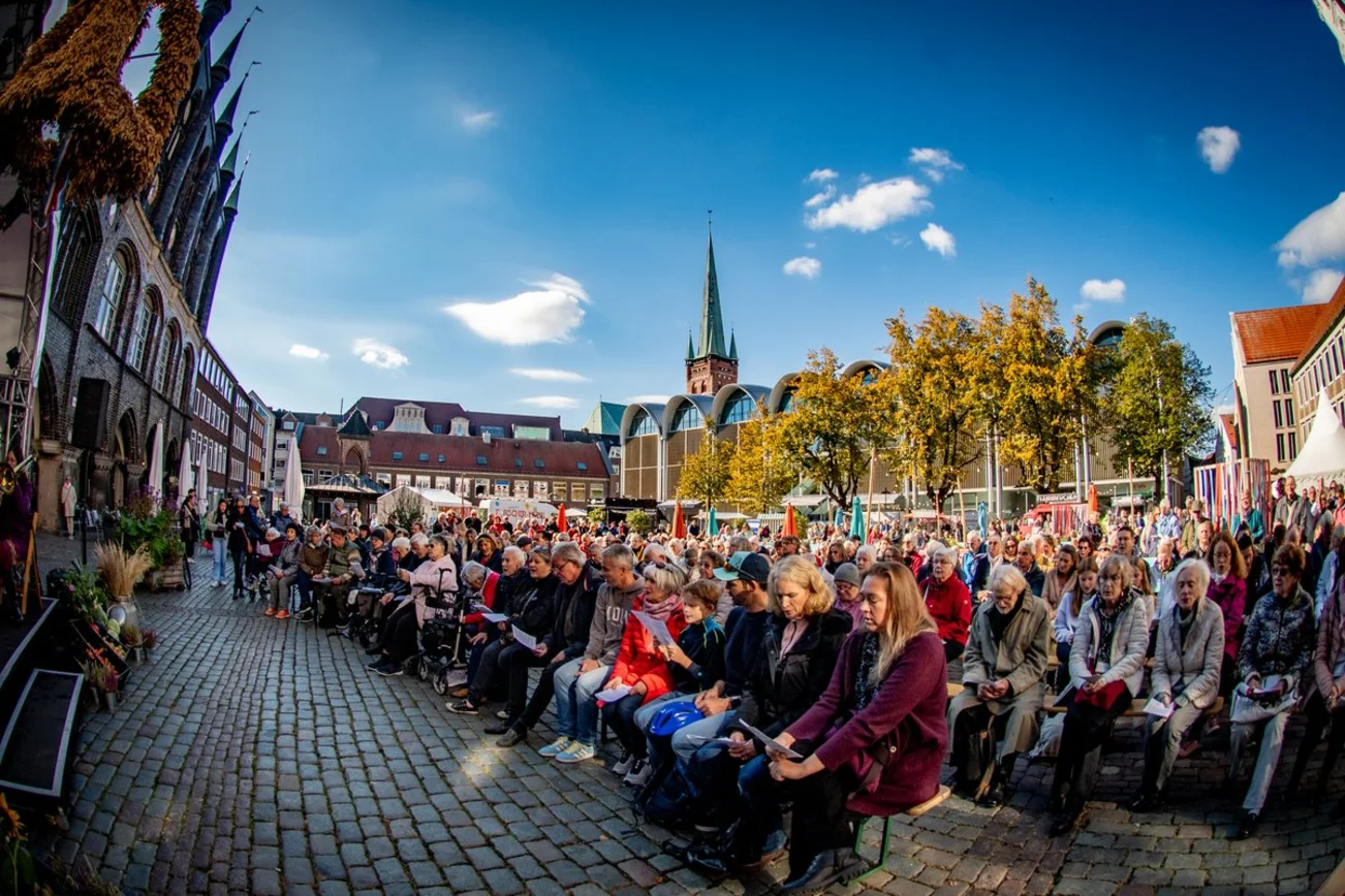 Lübeck. 500 Menschen haben auf dem Markt in Lübeck Erntedankfest (6. Oktober 2024) gefeiert. In dem Open-Air-Gottesdienst, geleitet von Marienpastor Robert Pfeifer und St.-Jakobi-Pastorin Bärbel Reichelt, feierte zugleich der 7Türme+ Kalender 2025 seine Premiere. Besuchende konnten zu Gunsten von “Brot für die Welt" frisch gebackenes Sauerteigbrot erwerben. Mit Unterstützung der “Schiffergesellschaft” wurde Fliederbeersuppe zu Gunsten der sieben Türme ausgeschenkt.
