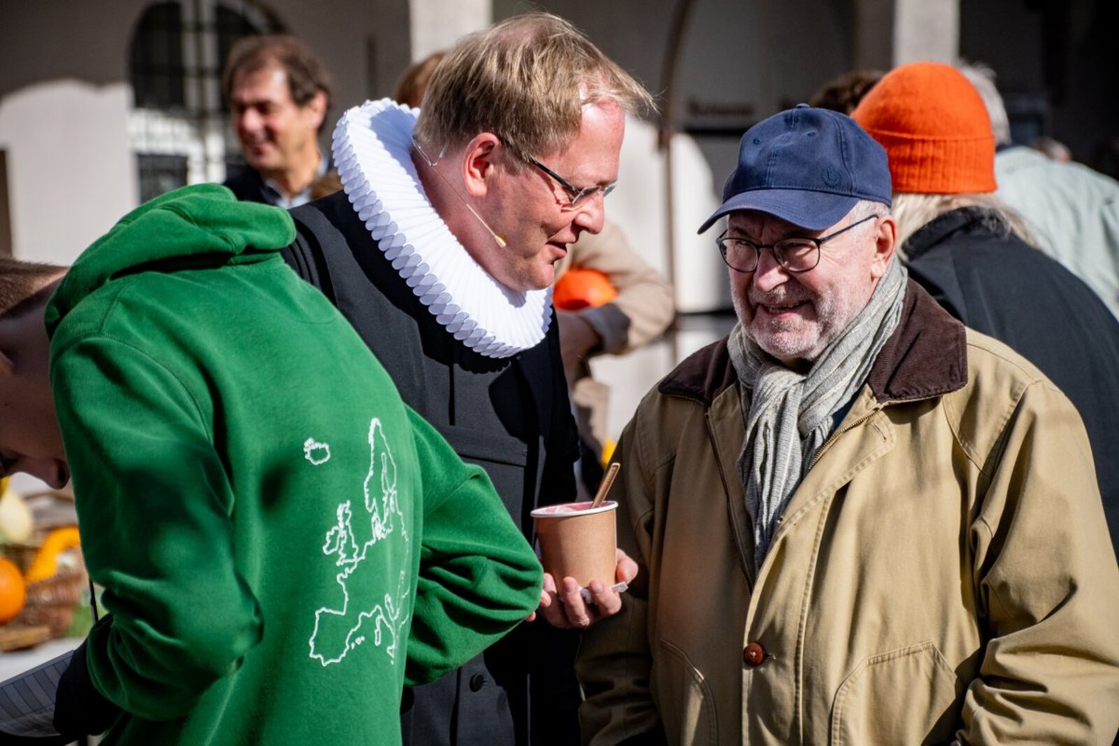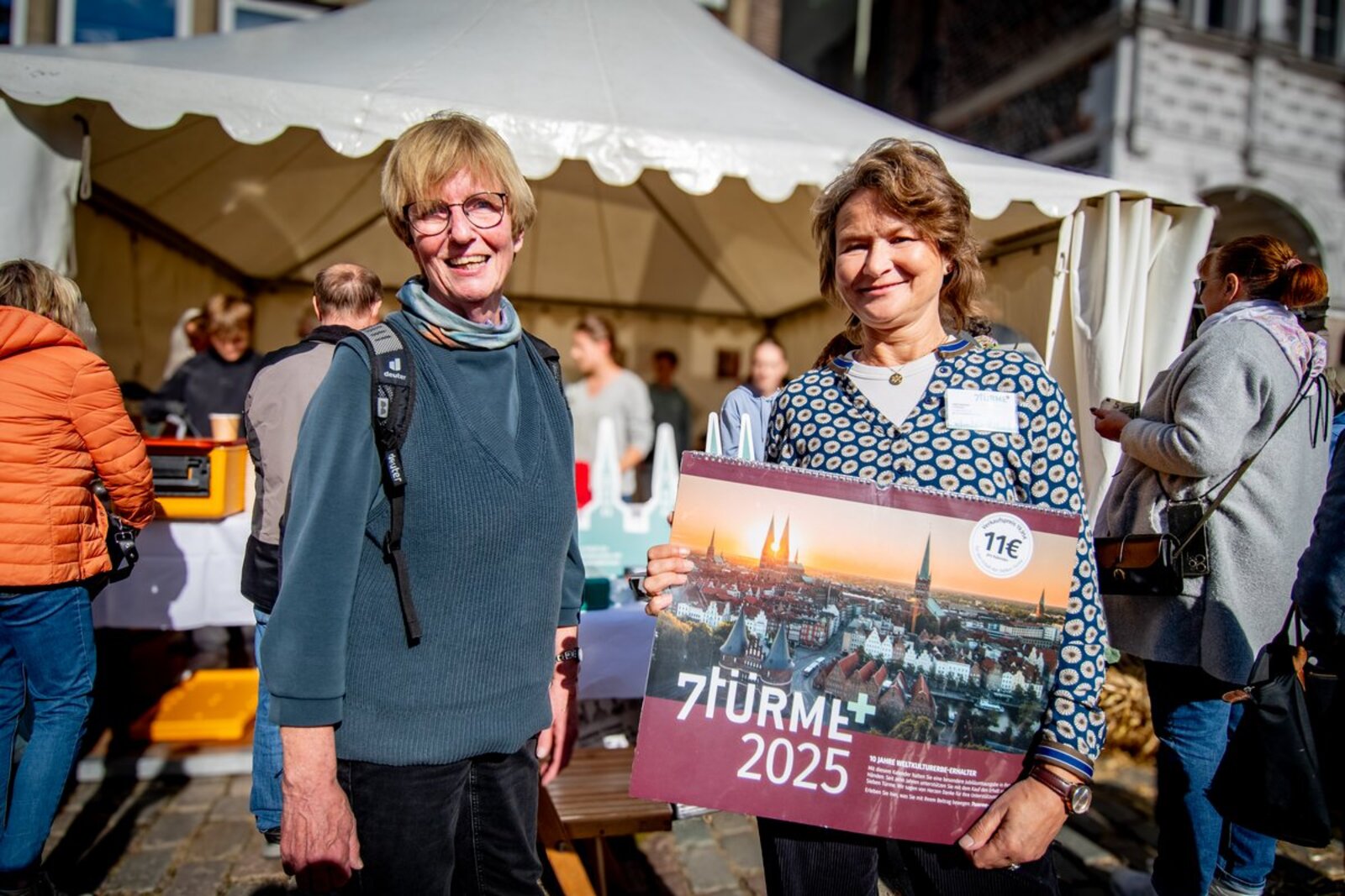 Die Besuchenden des Erntedankfestes konnten den 7Türme+ Kalender exklusiv auf dem Markt erwerben. Ab dem 7. Oktober 2024 wird er in zwölf Lübecker Geschäften, darunter viele langjährige Kalender-Paten, zum Preis von 19,95 Euro erhältlich sein. Elf Euro kommen als Spende den notwendigen Sanierungsarbeiten an den fünf Altstadtkirchen zu Gute. Heiß begehrt war auch die Fliederbeersuppe, die das Team der Schiffergesellschaft anbot. Auch dieser Erlös fließt in die Arbeit der Stiftung i.G. 7Türme+.