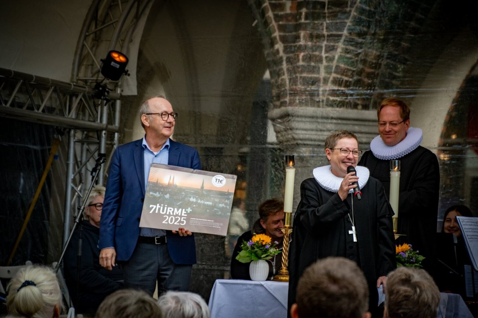 Zugleich feierte der 7Türme+ Kalender 2025 seine Premiere. Pröpstin Petra Kallies und Ralf Nagel, Projektleiter der Stiftung i.G., übernahmen die Vorstellung. “Dieser Kalender ist etwas ganz Besonderes: Er ist ein Jubiläumskalender, der Zehnte”, sagte Petra Kallies. Sie dankte den Fotograf:innen der vergangenen Jahre für ihr ehrenamtliches Engagement und stellte Oliver Beck, den Fotografen des aktuellen Kalenders, vor. "Dieser Kalender ist aber auch ein