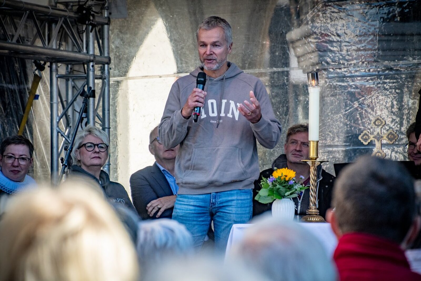 Feierlich, fröhlich, musikalisch, zugleich aber mit klaren Botschaften - so lässt sich der gut einstündige Gottesdienst auf dem Lübecker Markt umreißen. “Teilen kann so schön sein”, sagte Pastor Pfeifer, der gemeinsam mit seiner Kollegin Bärbel Reichelt und den Konfirmand:innen beider Innenstadtgemeinden das Programm zum Erntedankfest vorbereitet hatte. Beide Pastor:innen riefen dazu auf, im Alltag dankbarer zu sein, auch für alltäglichen Dinge. Zugleich appellierten sie, all diejenigen nicht zu vergessen, bei denen es selbst für das Nötigste kaum reicht.