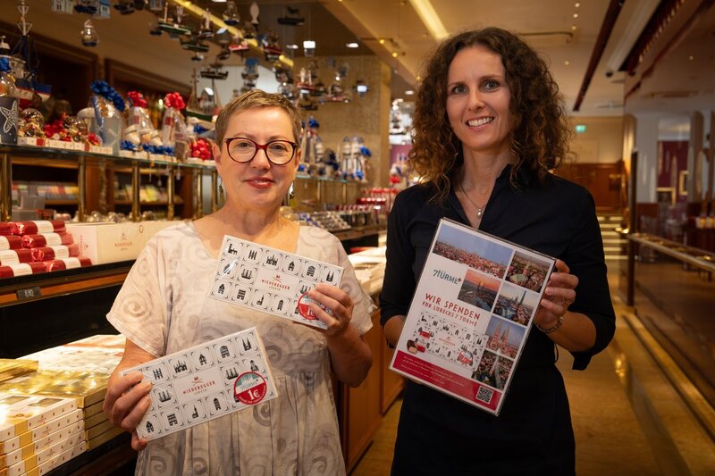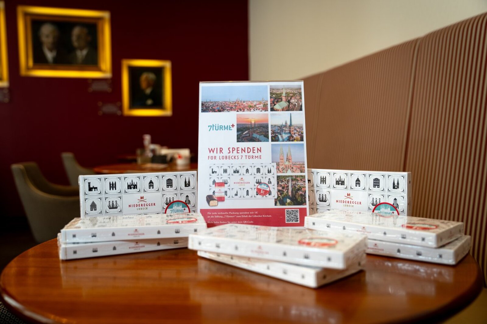 Im traditionsreichen Café Niederegger ist jetzt (12. Juli 2024) ein neues Unterstützungsprojekt vorgestellt worden, das den Erhalt der fünf Lübecker Altstadtkirchen unterstützen soll. Theresa Mehrens-Strait, die geschäftsführende Gesellschafterin von Niederegger, präsentierte gemeinsam mit Lübecks Pröpstin Petra Kallies die Verkaufsaktion, deren Erlös der in Gründung befindlichen Stiftung 7Türme+ zugutekommen wird. Pro verkaufter Packung spendet das Unternehmen einen Euro an die Stiftung.