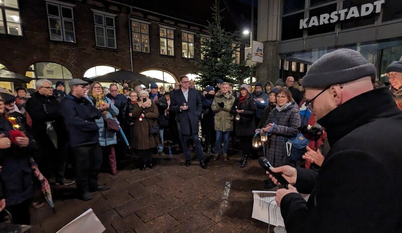 Auf dem Schrangen in der Lübecker Innenstadt hängt bereits der erste Weihnachtsschmuck. Vor dieser Kulisse versammeln sich am Sonntag, 19. November 2023, Hunderte von Christ:innen aus der Hansestadt. Sie sind einer Einladung des Ev.-Luth. Kirchenkreises Lübeck-Lauenburg und der Arbeitsgemeinschaft Christlicher Kirchen in Lübeck (ACK) gefolgt. „Dass so viele Menschen heute hier sind, ist ein wichtiges Zeichen“, begrüßt Arne Kutsche, der stellvertretende Propst in Lübeck, die Teilnehmer. Viele von ihnen tragen Laternen, einige sogar Lichterketten. Unter ihnen ist auch Lübecks Bürgermeister Jan Lindenau. Er hat ein Teelicht in einem Marmeladenglas mitgebracht.