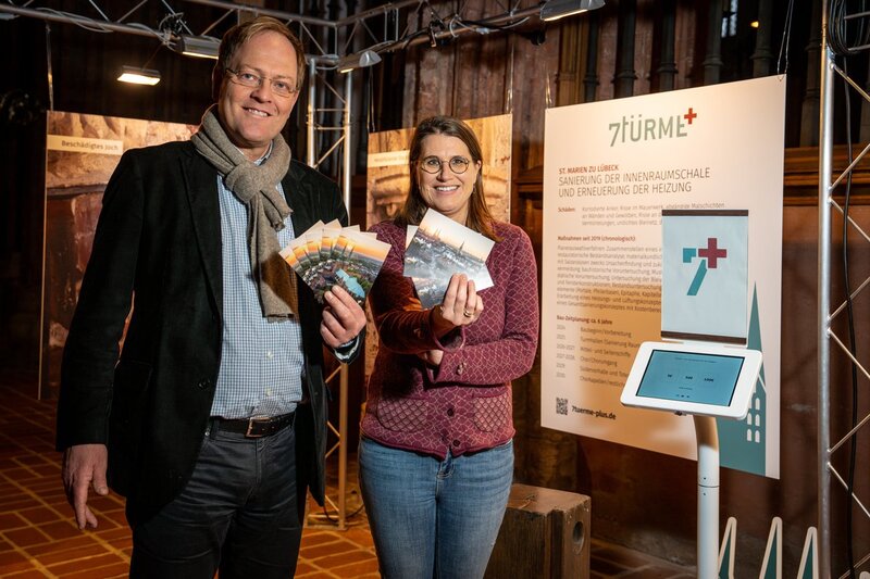 Besucherinnen und Besucher der Ausstellungen haben zudem die Möglichkeit, in St. Marien und im Dom ab sofort die neuen 7Türme+ Postkarten mitzunehmen. Die Karten zeigen die charakteristischen Türme der Lübecker Altstadt, fotografiert von Oliver Beck. Für den Dom gibt es eine Sonderauflage. „Überdies besteht die Möglichkeit, in beiden Kirchen die Arbeit von 7Türme+ aktiv an unseren neuen Spendensäulen zu unterstützen“, berichtet Robert Pfeifer, Pastor in St. Marien.
