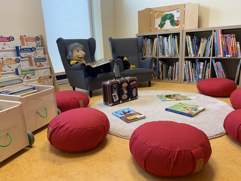 Unter dem Motto “Sprache verbindet” macht die integrative Kita Literacy (Erzähl-, Sprach- und Schriftkultur) zum Herzstück ihrer Arbeit. Eine eigene Kita‑Bücherei mit über 1.500 Titeln, in der ganzen Einrichtung verteilte Leseecken für alle 85 betreuten Kinder, Kamishibai, Bilderbuchkino, ritualisierte Vorleseangebote und Erzählrunden sorgen für regelmäßige Leseerfahrungen.