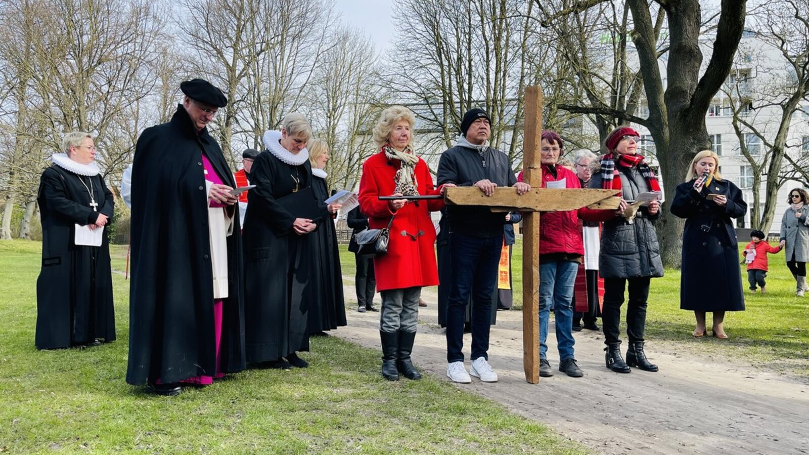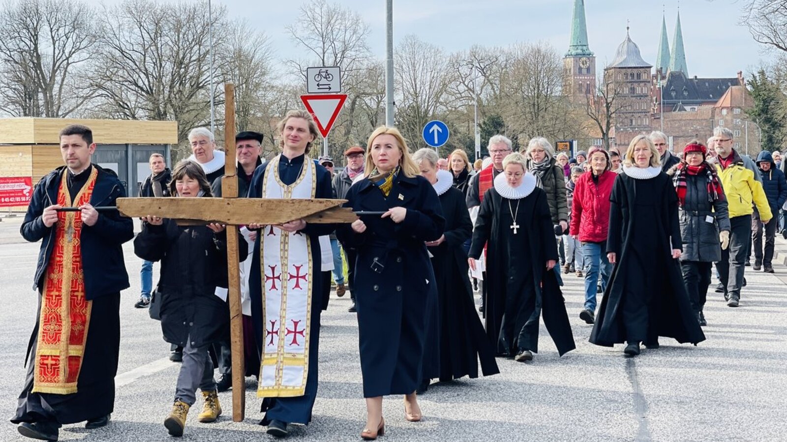 Lübeck. 700 Gläubige pilgerten den ökumenischen Kreuzweg an Karfreitag– von St. Jakobi bis zum Jerusalemsberg. Er stand unter dem Titel „Bedrohung.Mut.Frieden“ und legte den Schwerpunkt auf den russischen Angriffskrieg in der Ukraine.