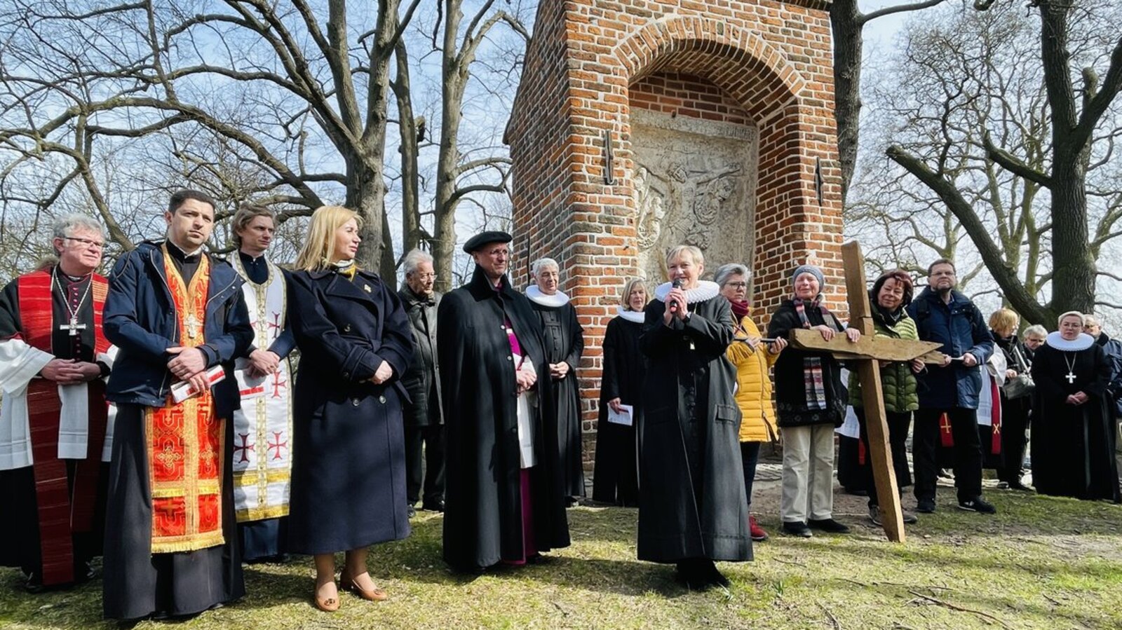 An der zweiten Station am Burgtor sprach Anke Laumayer, Enkelin des von den Nazis ermordeten Lübecker Märtyrer Karl Friedrich Stellbrink: „Mein Großvater hatte den Mut, die Wahrheit zu sprechen, sodass selbst seine Kirche nichts mehr mit ihm zu tun haben wollte. Eine Wahrheit, die niemand hören wollte. Er ließ sein Leben dafür, ließ seine geliebte Frau zurück mit all ihren Sorgen und Ängsten. Und doch vertraute er auf die Worte Jesu im Johannes-Evangelium: ‚Meinen Frieden hinterlasse ich euch, meinen Frieden gebe ich euch‘“. Der Krieg sei so nah wie lange nicht mehr, Verhandlungen führten ins Leere. Wichtiger denn je seien Gebete und der Mut der Menschen, sich mit sich selbst auseinanderzusetzen. Denn hier beginne der Frieden.
