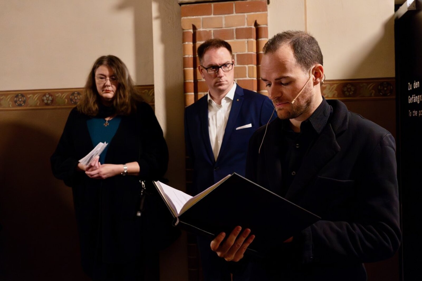Musikalisch umrahmt wurde der Abend vom Kammerchor „I Vocalisti“ unter der Leitung von Hans-Joachim Lustig. Schauspieler des Theater Combinale und des Theater Lübeck, Ludwig-Christian Glockzin und Vincent Türpe, lasen an wechselnden Orten - im orangefarbenen Scheinwerfer-Licht im Langen Saal oder im kalten Licht des ehemaligen Gerichtstrakts - aus Briefen der Märtyrer an ihre Familien oder an Weggefährten vor. Die Hausdurchsuchung durch die Gestapo, die Willkür der Justiz, die Leere der Haft, die Gedanken an das nahende Ende. Beinahe greifbar - spürbar waren die Gefühle und Gedanken der vier Geistlichen, denen trotz allem zwei Dinge nicht verloren gingen: ihr Mut, Haltung zu zeigen, die Wahrheit auszusprechen, und ihr grenzenloses Vertrauen in Gott.