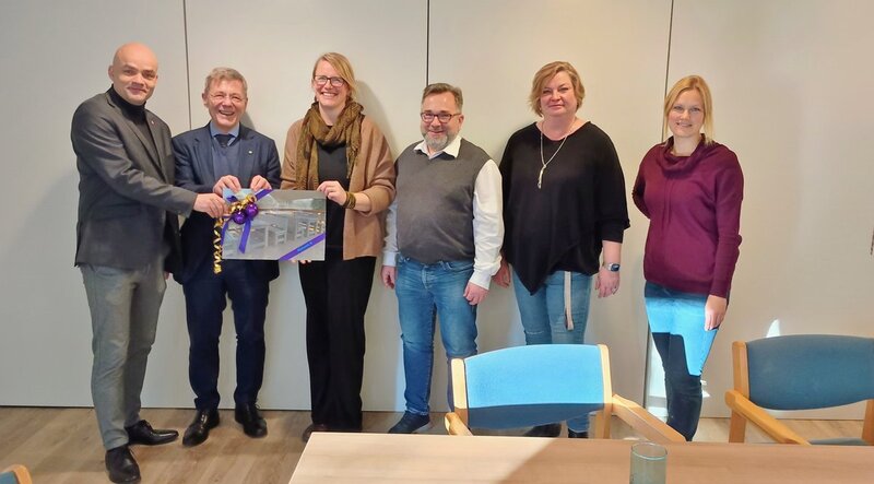 Symbolisch überreichte der Landespastor ein Bild der Bänke und Tische, die in Kürze in Mölln ankommen, an Bürgermeister Ingo Schäper. Gefertigt werden diese in den Rendsburger Werkstätten unter Trägerschaft vom Diakonie-Hilfswerk Schleswig-Holstein.