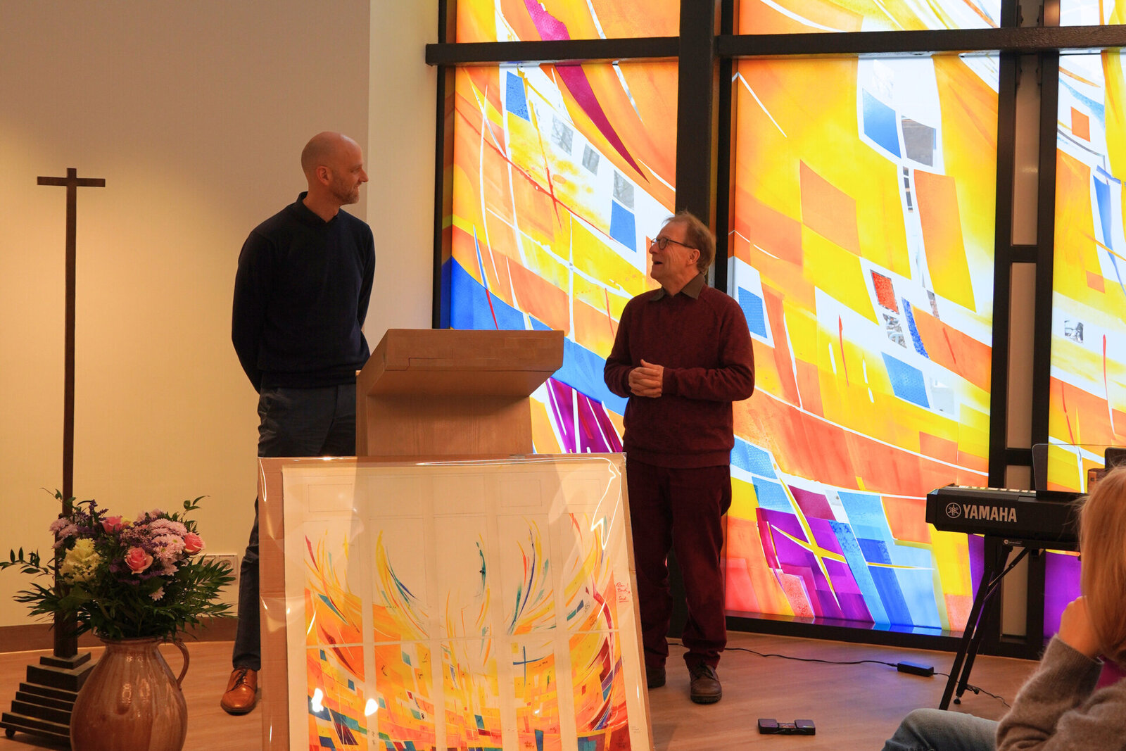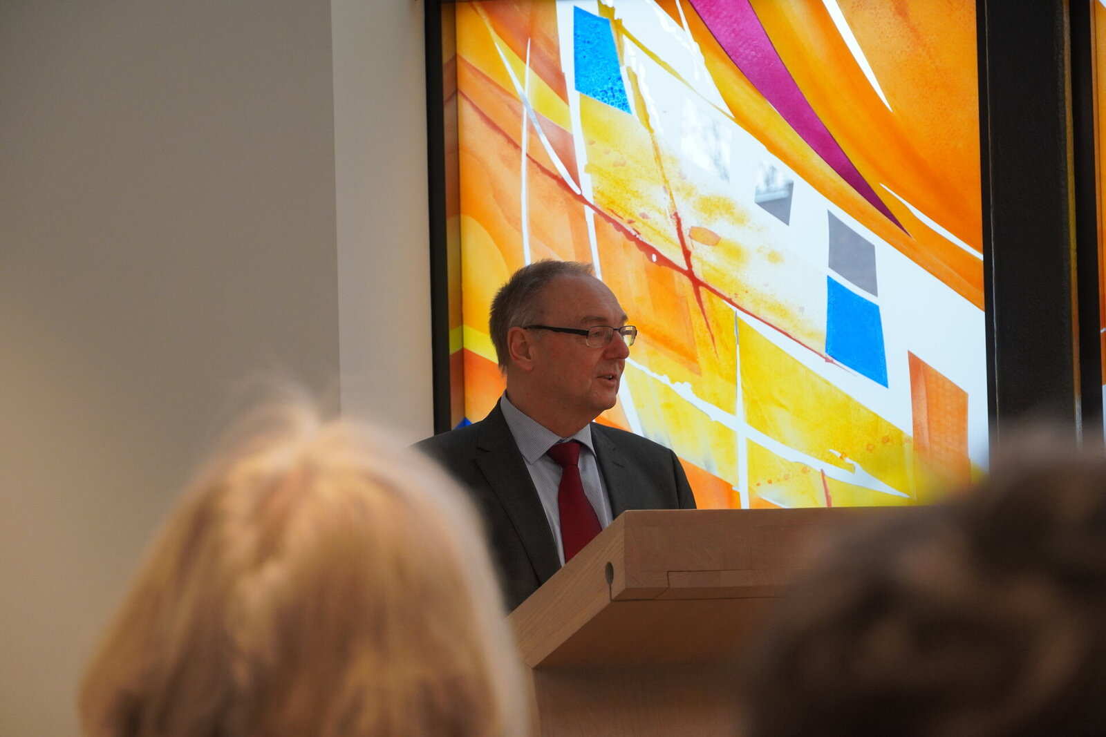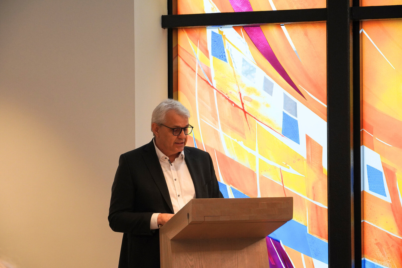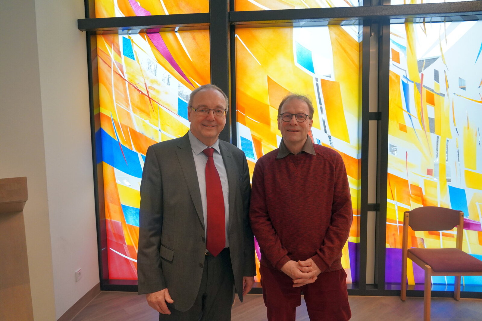 Die einladende Atmosphäre des rund 60 Quadratmeter großen und mehr als fünf Meter hohen Raums wird von der 20 Quadratmeter großen Fensterfront geprägt, die der schleswig-holsteinische Glaskünstler Jörgen Habedank entworfen hat. Die großformatigen Glasscheiben lassen in Rot-, Gelb- und Orangetönen mit blauen Akzenten ein warmes, lebendiges Lichtspiel entstehen.