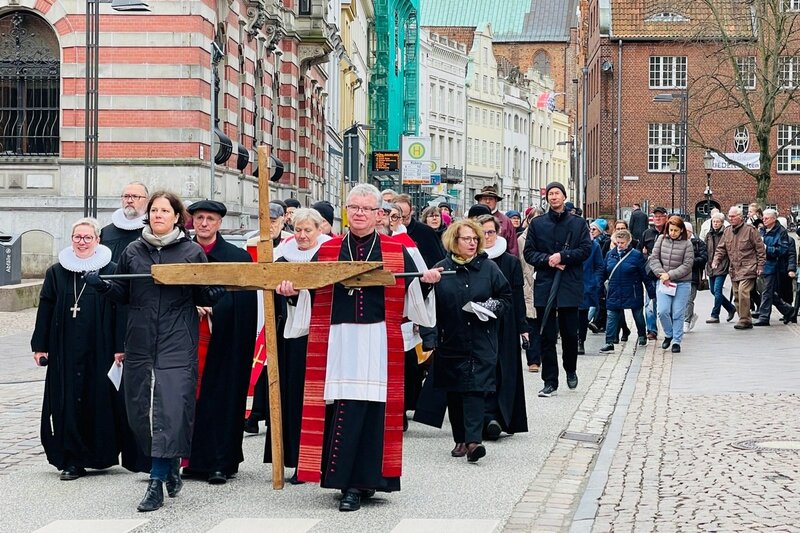 Auch Bischöfin Kirsten Fehrs betont die Aktualität des Kreuzwegs. Er lasse in diesem Jahr erahnen, wie die Grundwerte menschlichen Zusammenlebens weltweit auf dem Spiel stehen: “Damals wie heute: Wenn Menschen sich für Gottes Weltordnung einsetzen, für die Würde und das Recht aller Menschen, dann stoßen sie mit Weltbildern und Ideologien zusammen, die Liebe und Barmherzigkeit zum Feindbild erklärt haben.”