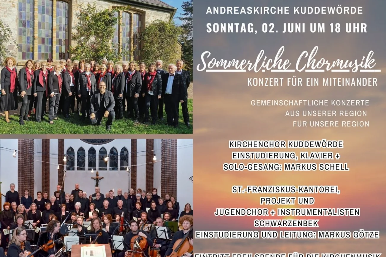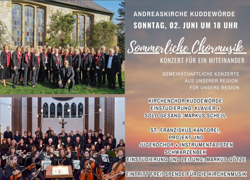 Am 2. Juni 2024  werden ab 18 Uhr in der Andreaskirche Kuddewörde viele Chorstimmen erklingen.Denn es wird ein bunt gemischtes  Konzert verschiedener Chöre geben.  Der KirchenChor unter der Leitung von  Markus Schell wird dieses Konzert abwechselnd und gemeinsam mit Chören unter Markus Götzes Leitung gestalten.