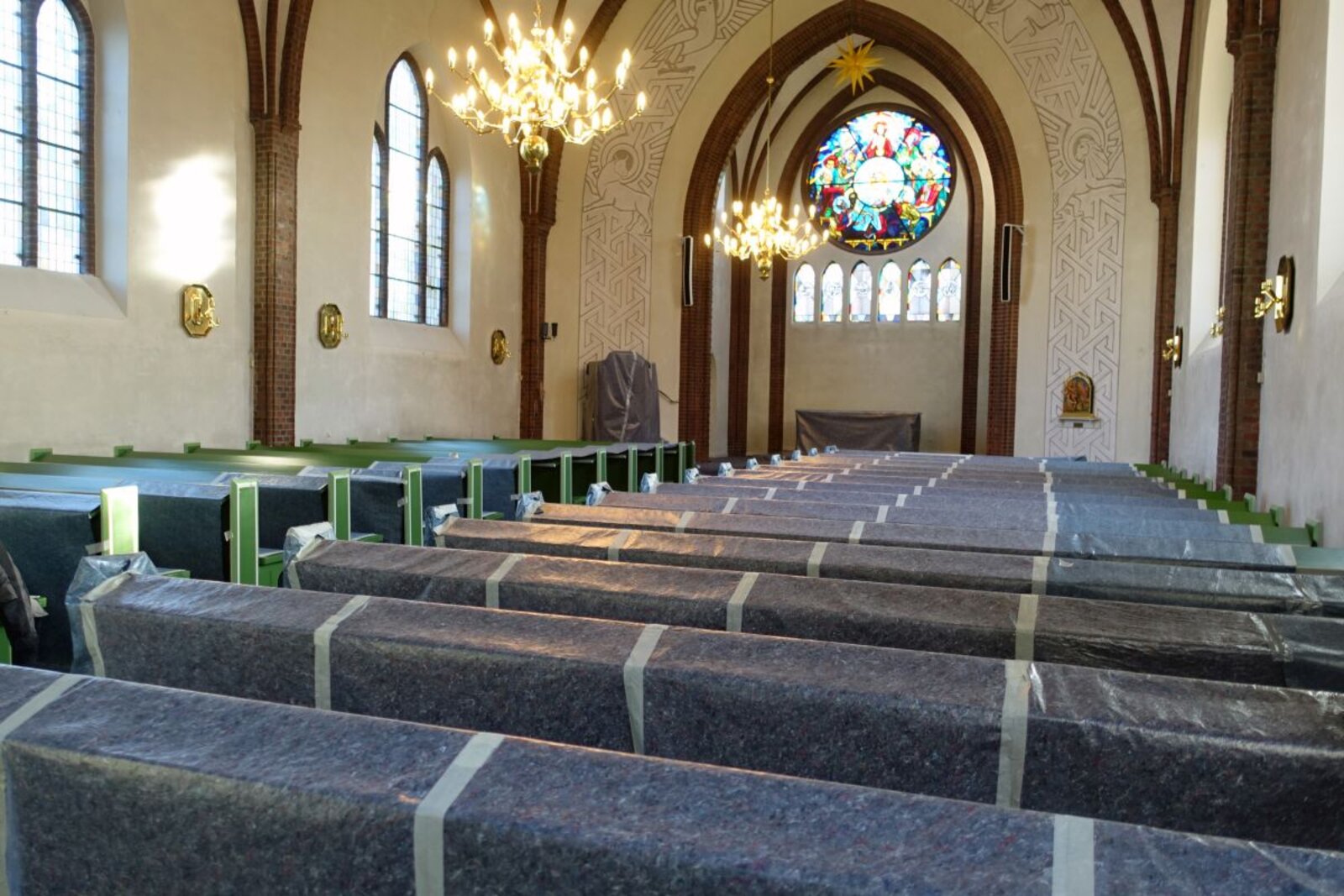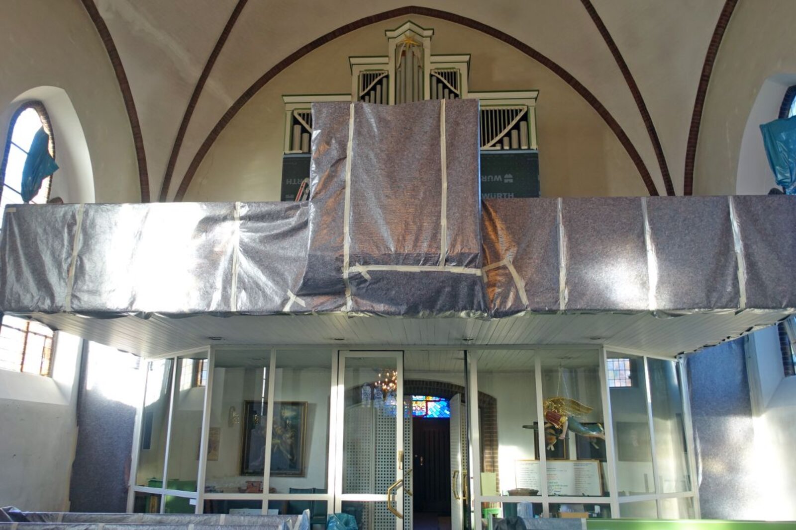 Seit dem Beginn der Arbeiten, die sich auf den Innenraum konzentrieren, schützt Malervlies die Einrichtung vor Staub und Schmutz. „Es sieht aus wie ein Werk des Verhüllungskünstlers Christo“, schmunzelt Schöer. Im nächsten Schritt wird ein Gerüst mit einer Plattform aufgebaut, das sich über das gesamte Kirchenschiff erstreckt. Zur Stabilisierung der Kirche werden dauerhaft drei Stahlrohre eingesetzt, die im Innenraum sichtbar bleiben.