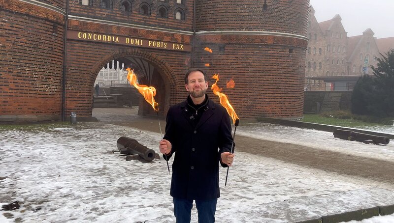 Lübeck. Neben Theologie und Seelsorge begeistert sich Christopher Paulsen, Pastor im Pfarrsprengel Lübeck-Ost, für Feuerkunst. In seinem "Segen2go" bringt er vor Lübecker Kulisse beides zusammen.