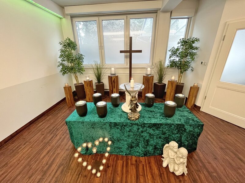 Lübeck. Zwölf schwarze Urnen stehen auf dem Altar der Trauerhalle. Eine große Kerze brennt, ein schlichtes Kreuz ziert das Fenster. Nach und nach betreten Frauen und Männer den Raum, blicken zu den Urnen, verneigen sich, falten die Hände und nehmen leise Platz. Einmal im Monat finden an einem Donnerstag im Bestattungshaus Müter Aussegnungen statt – eine seit 2013 gelebte ökumenische Praxis der evangelischen und katholischen Kirche.