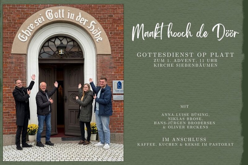 Söbenbömen. An`n 1. Dezember ward in Söbenbömen wedder ein besondern Gottesdienst fiert. In dit Joahr erstmalig ward de Gottesdienst taun ersten Advent op Plattdeutsch fiert. “Ik freu mi över dat engagierte Gottesdienst-Team mit ein bunte Mischung an Menschen ut uns Kirchengemeinde” seggt Pastor Oliver Erckens.
