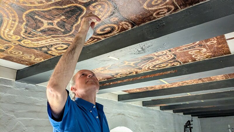 Pastor Albrecht Martins ist schwindelfrei. Behände steigt er die Gerüstleitern hinauf. Die Behelfsebenen, die für die Restauratoren aufgebaut haben, führen bis unter die Kirchendecke. Hier, ganz oben, zeigt Albrecht Martins, was im vergangenen Jahr für Begeisterung unter Laien und Fachleuten gesorgt hat.