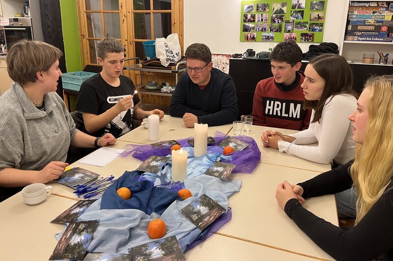 Am Ende ist immer Zeit für eine kleine Andacht zu einem bestimmten Thema. Heute geht es um Dankbarkeit. In der Mitte des Tischs werden drei Kerzen angezündet. "Wart ihr heute für etwas dankbar? Habt ihr euch bei jemandem bedankt?" Über diese Fragen kommt die Gruppe ins Gespräch. Auf Postkarten können die Jugendlichen kleine Dankes-Grüße aufschreiben und anschließend verschicken. Nächste Woche treffen sie sich wieder, dann in Sandesneben.