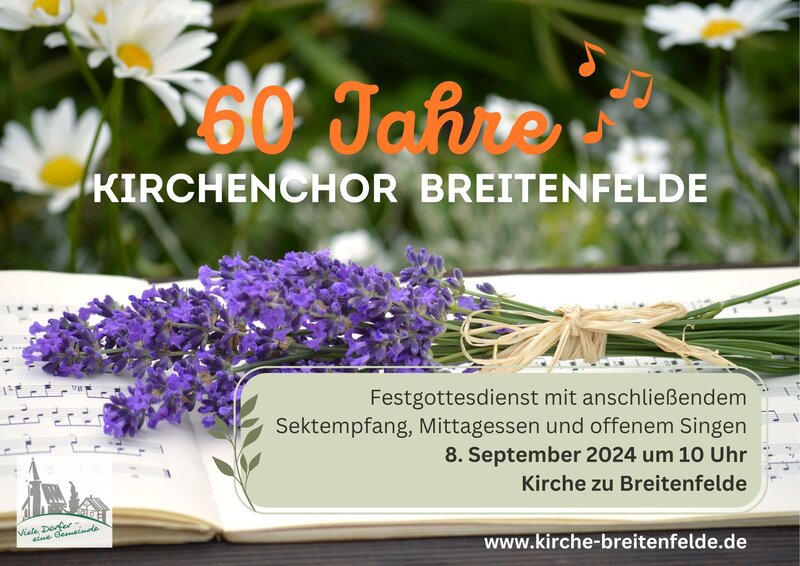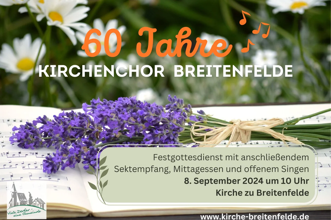 Unser Kirchenchor Breitenfelde feiert in diesem Jahr sein 60-jähriges Bestehen! Zu diesem schönen Anlass wird es am Sonntag, 8. September 2024, um 10 Uhr in der Breitenfelder Kirche einen Festgottesdienst geben!