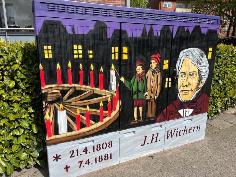 Im Stadtteil Lübeck-Moisling und der Wichern-Gemeinde erinnert ab sofort ein besonderes Graffiti an den Namensgeber der Kirchengemeinde. Auf der Straßenseite gegenüber der  Kirche ist ab sofort das Bild von Johann-Hinrich Wichern zu sehen. Nicht nur sein Portrait und seine Lebensdaten sondern auch sein Lebensprogram, vor allem an die Kinder zu denken, stehen im Mittelpunkt des farbenprächtigen Werkes. Die Errungenschaft, die ihn zu einem der berühmtesten Theologen gemacht hat, ist natürlich auch mit dabei. Denn 1839 hat er den allerersten Adventskreis für das Rauhe Haus in Hamburg erfunden, damit die Kinder zählen konnten, wieviel Tage sie noch bis zum Heiligen Abend warten müssen. So hat auch die Wichern-Gemeinde in Moisling vor über zehn Jahren das Original (vier weisse und vier mal sechs rote Kerzen auf einem Wagenrad) nachgebaut, der jedes Jahr zum ersten Advent leuchtet.